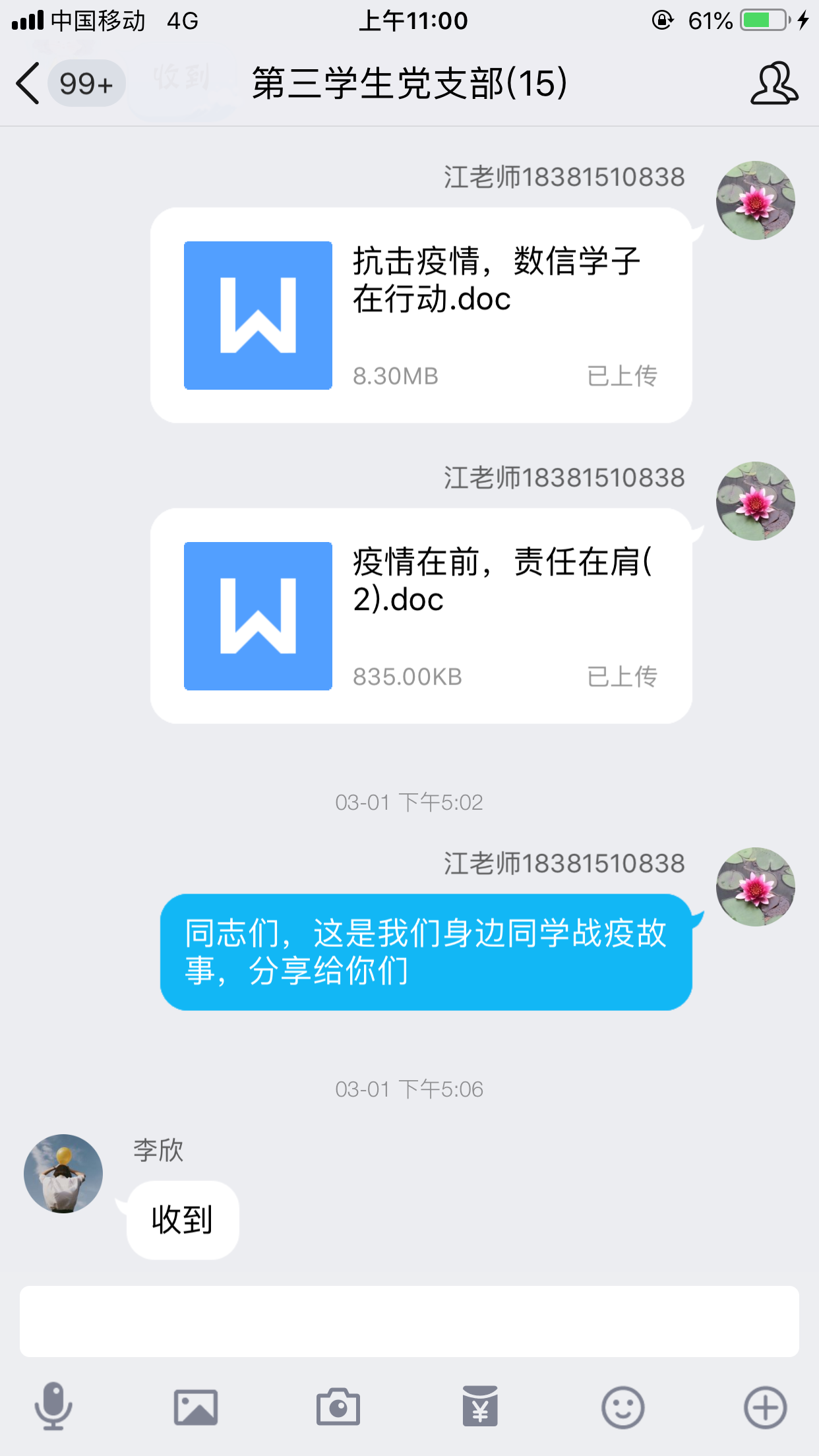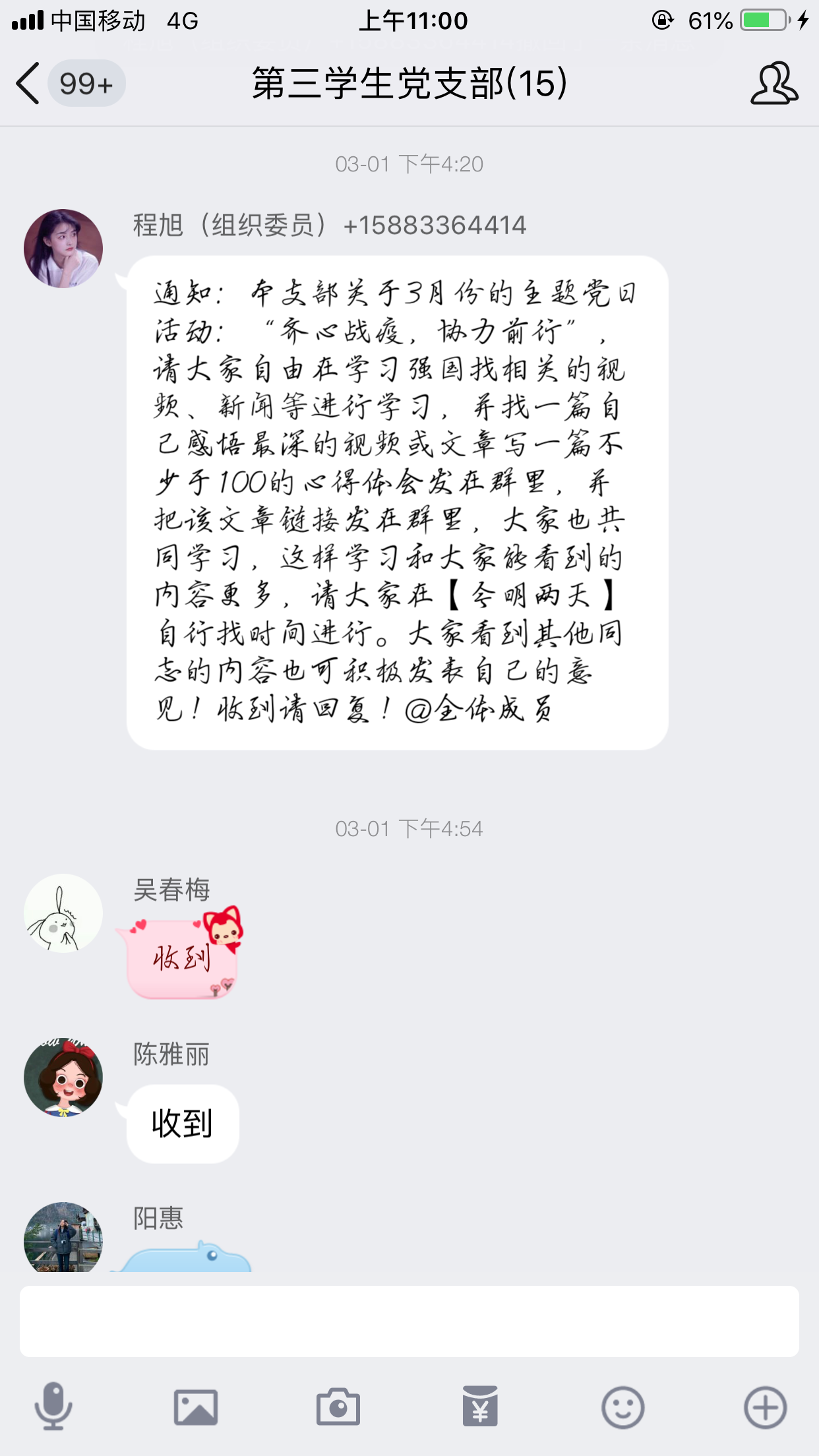 本网讯(文、图/阳惠、程旭)时逢全民抗疫的特殊时期,数信学院第三学生党支部于2020年3月1日通QQ开展了一次别开生面的主题党日活动。活动由党支部书记江纳主持,支部全体党员参加。