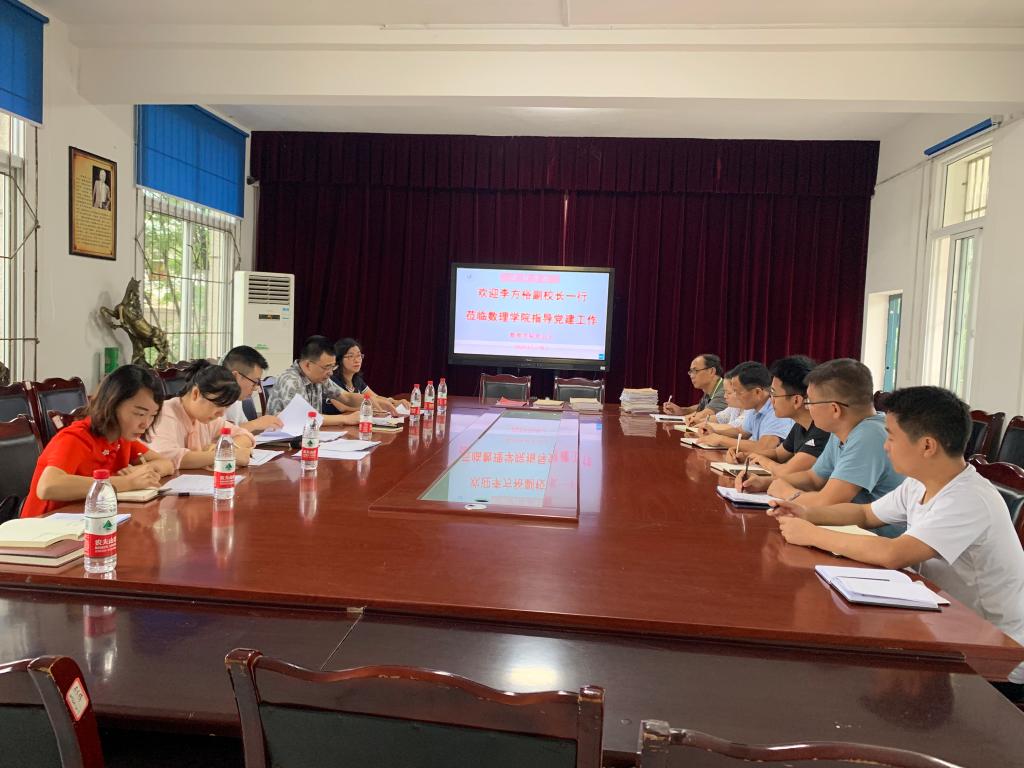 本网讯(文/陈红君,图/江纳)7月16日,李方裕副校长带领学校党委组织部副部长刘馨、干部科科长魏群、组织科副科长陈俊文、党校办公室主任徐丽珊等到数理学院检查、指导基层党建工作。检查、指导座谈会在学院会议室进行。学院主持工作副院长屈小兵、院长助理黄凯、党政办主任陈红君、学生科长陈盈舟,以及辅导员参加了检查、指导活动。