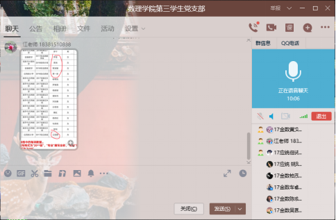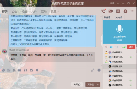本网讯(文、图/姚瑶)2020年8月16日下午17:00,数理学院第三党支部召开网络会议。会议的主要议题是讨论2020年上学期发展对象的入党条件是否合格的问题。数理学院第三党支部全体党员,预备党员参加了此次会议。会议由党支部书记江纳主持。