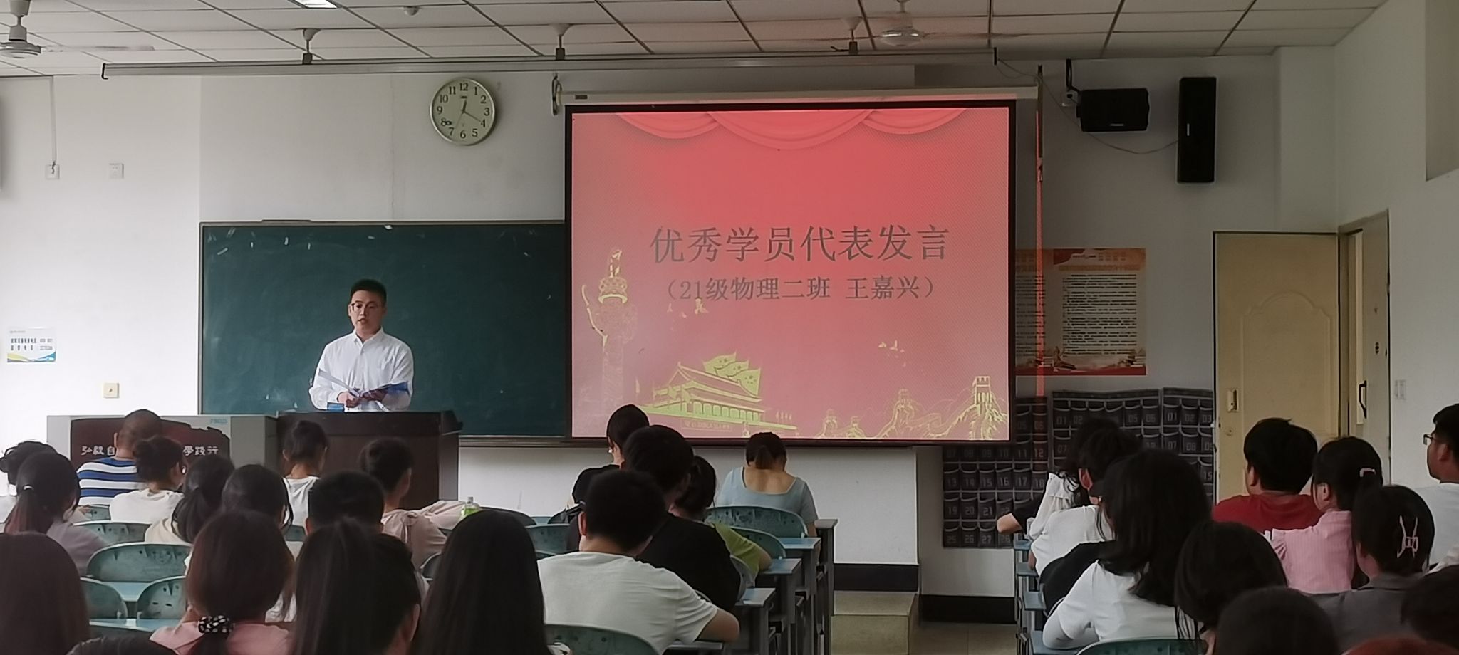 结业典礼在齐唱《国际歌》的歌声中拉开帷幕。随后,陈盈舟宣读了本期党校结业名单及优秀学员名单。作为本期优秀学员代表,2021级物理学专业王嘉兴同学在发言中分享了自己的学习心得和收获。他说,通过本次党校学习,无论是从思想还是行动上都让自己有了全新的变化,思想上加深了对党的认识,进一步端正了入党动机,坚定了共主义理想信念;行动上,目标更明确,在生活、学习中积极践行,更加积极投身到学业中来。