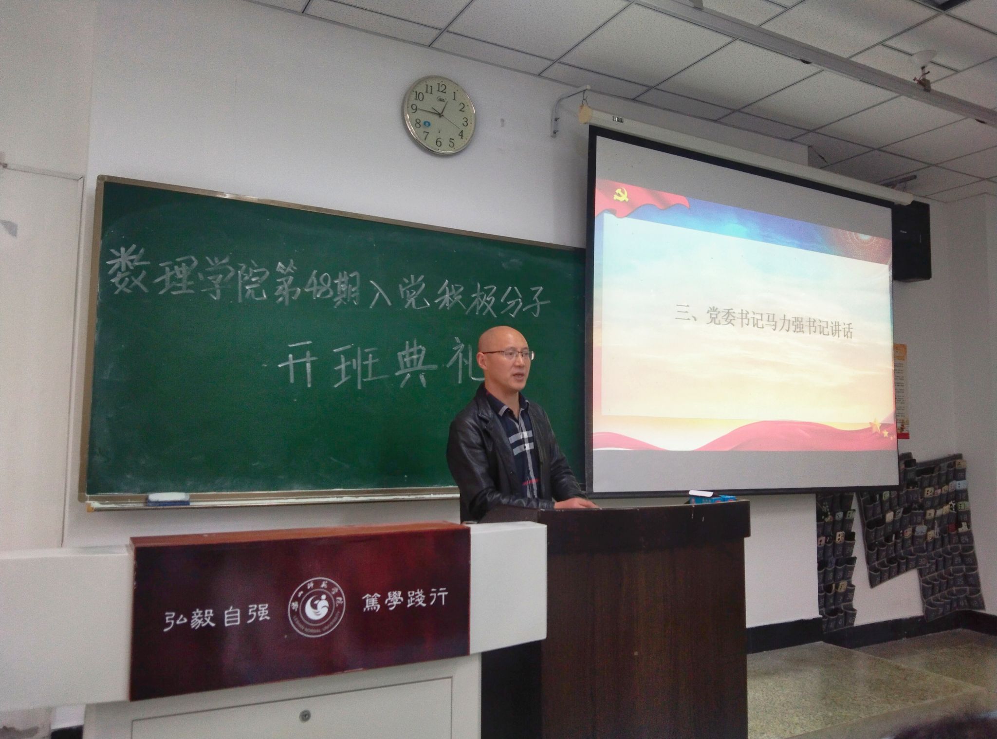 本网讯(文/杜佳兴 图/申莹) 10月16日,数理学院在行知楼112教室举行第48期入党积极分子党校开班典礼。出席本次开班典礼的有数理学院党委书记马力强、党委副书记左莉、辅导员陈新凯、学生党员代表以及第48期全体入党积极分子。