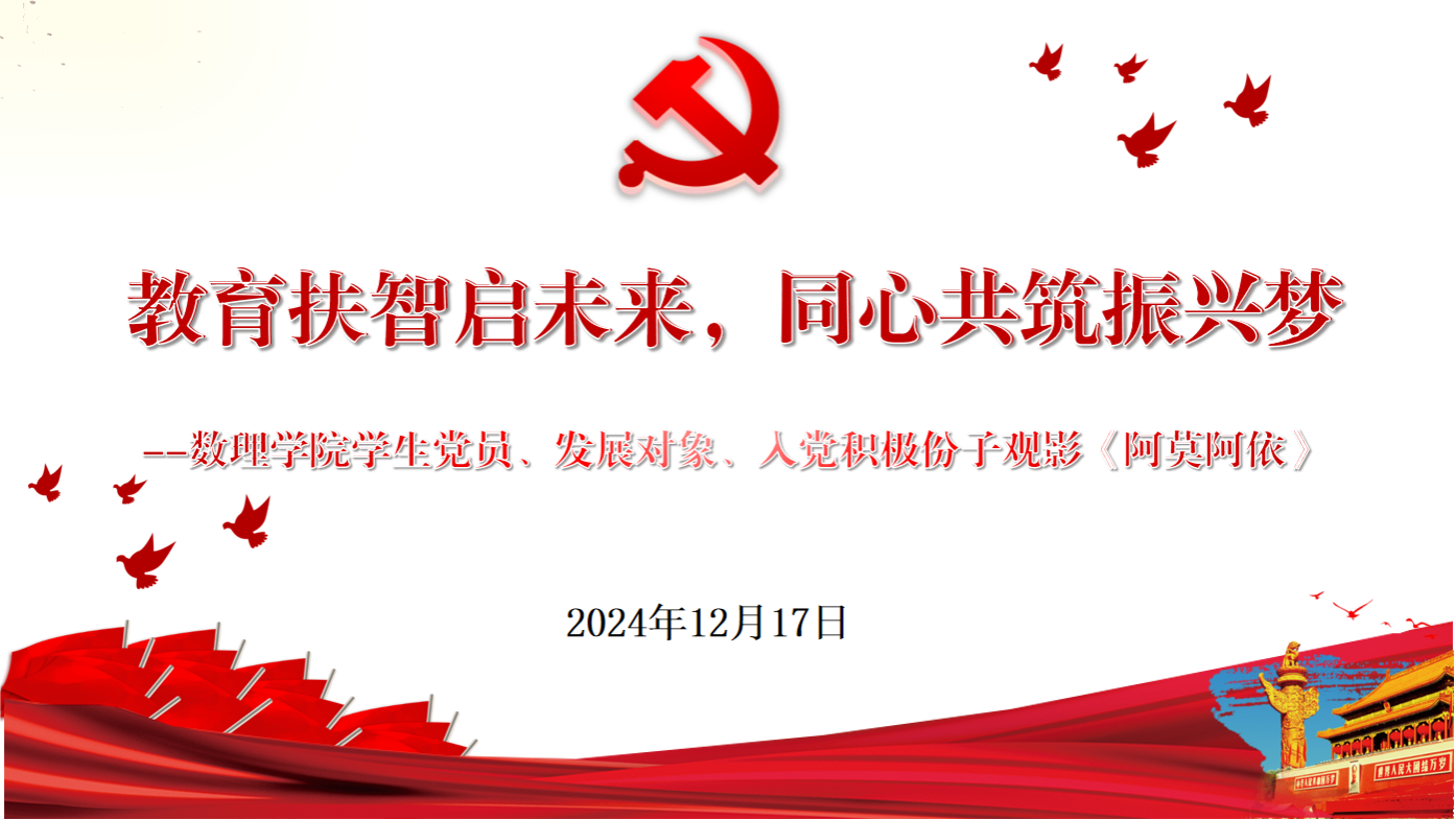 本网讯(文/图李羽婷)为深入学习贯彻习近平新时代中国特色社会主义思想,进一步强化青年学生对乡村振兴战略的理解和提高社会责任感,数理学院学生党支部于12月17日下午组织开展”教育扶智启未来,同心共筑振兴梦“红色观影活动。我院学生党员、发展对象和入党积极分子一同观看乡村振兴题材影片《阿莫阿依》。