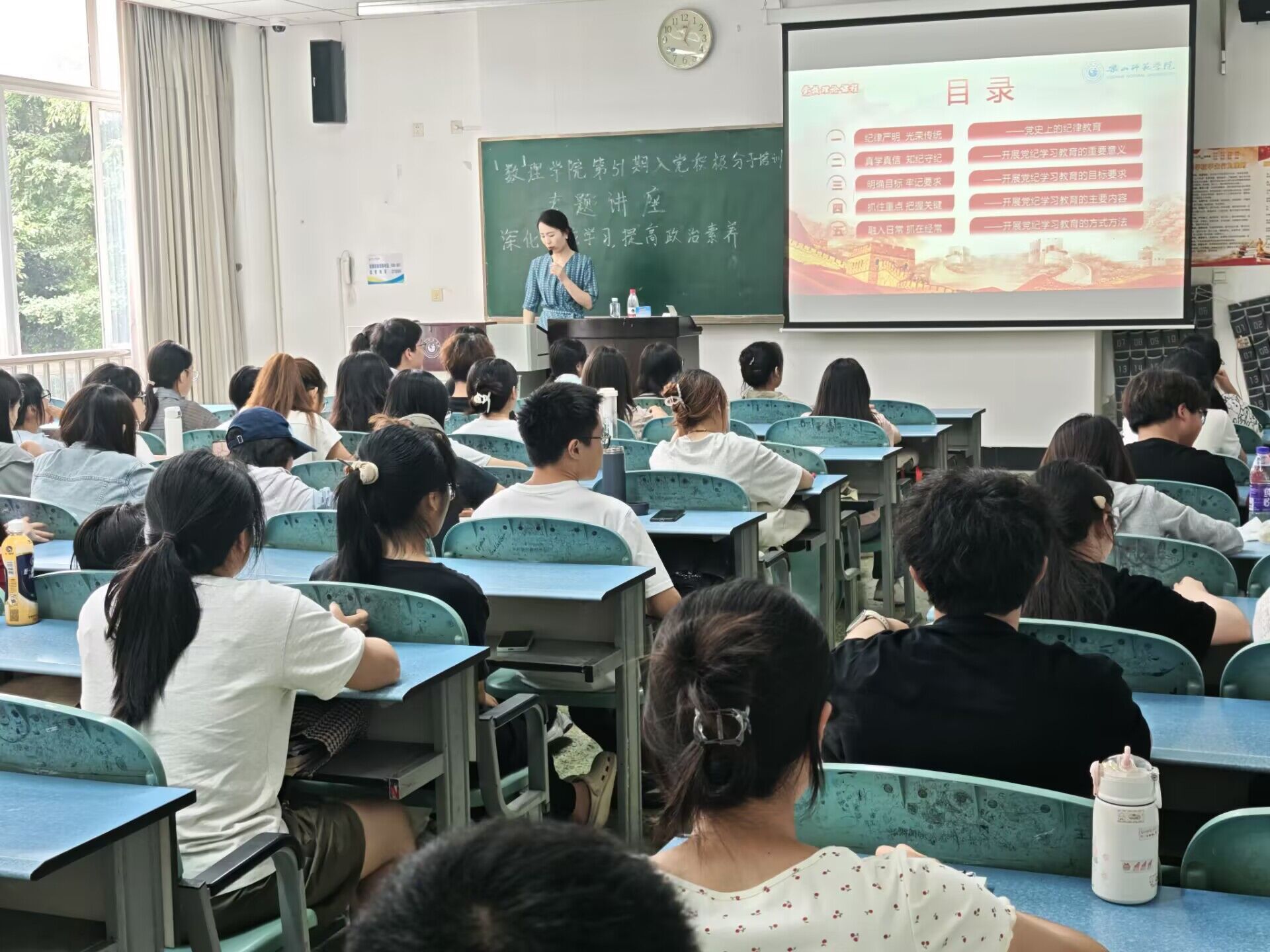 左莉围绕“深化理论学习,提高政治素养”的主题,重点介绍了党纪学习教育的主要内容、重要意义、目标要求以及党纪学习教育的方式方法,并对入党积极分子提出以下两点要求:第一,要自觉遵守党纪国法、校纪校规,强化组织观念,服从组织决定,履行党员的权利和义务;第二,把学习科学文化知识,提高综合素质能力视为党赋予自己的现实任务,以自己的实际行动,树立大学生党员的良好形象,为党旗增辉。