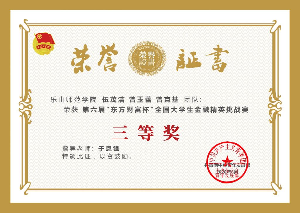 本网讯 (文、图/余恩锋) 近日,历时4个多月的第六届“东方财富杯”全国大学生金融精英挑战赛落下帷幕,数理学院金融数学专业学生参赛队获得1个二等奖、3个三等奖的好成绩。
