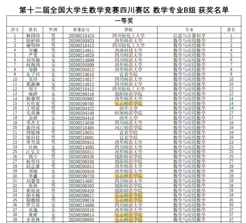 本网讯 (文、图/高仕龙) 11月28日在四川大学望江校区、江安校区和电子科技大学清水河校区三个场地同时举行的第十二届全国大学生数学竞赛(四川赛区)比赛结果于近日揭晓。我校学生喜获数学专业组一等奖6项、二等奖15项、三等奖29项,非数学专业组二等奖1项、三等奖6项的好成绩。