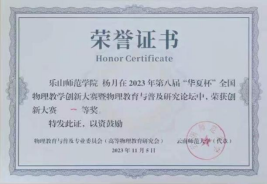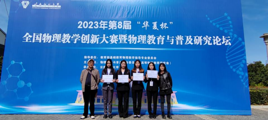 本网讯(文、图/许德富)第八届全国“华夏杯”物理教学创新大赛2023年11月3日在云南师范大学开幕,来自华东师范大学、东北师范大学、华中师范大学、西南大学等全国100所师范院校的500多名物理学专业本科生、研究生参加该项赛事,经过两天的紧张比赛,11月5日落下帷幕。我校数理学院物理学专业4名同学参加该项赛事,杨月同学展示的《探究平抛运动的规律》获本科生组一等奖,罗清同学展示的《大气压强的存在》荣获本科生组二等奖,李玉欢同学展示的《静摩擦力的大小》荣获本科生组三等奖,刘哲媛同学展示的《探究超重和失重的条件》荣获本科生组三等奖。