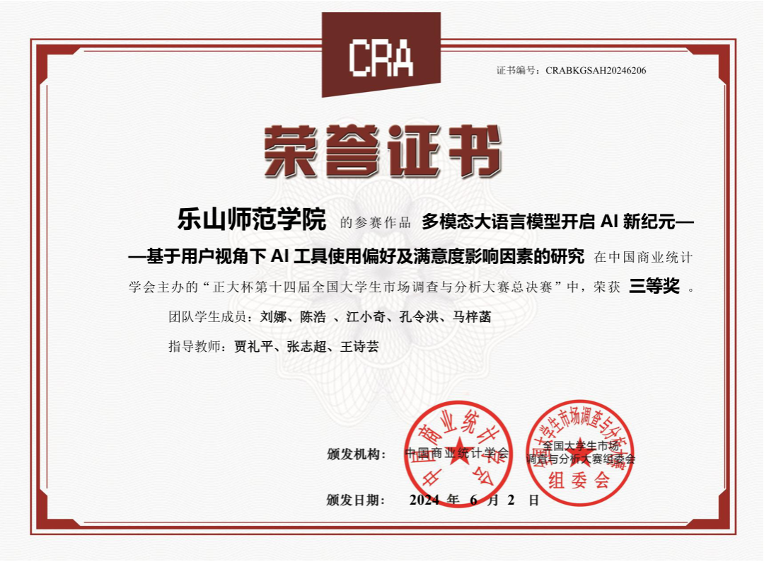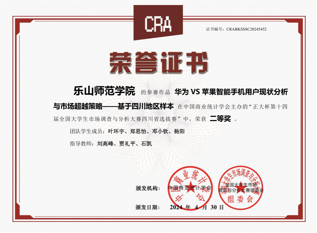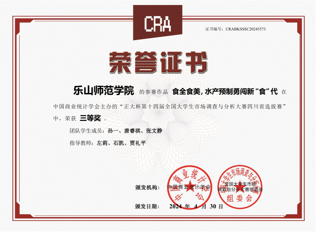 本届赛事,在数理学院领导的关心重视下,以应用统计学专业负责人石凯老师为负责人的指导团队指导下,由各专业学生组成的参赛团队凭借扎实的专业知识和出色的实践能力,荣获了全国三等奖1项,四川省赛一等奖、二等奖各1项,三等奖3项的优异成绩。
