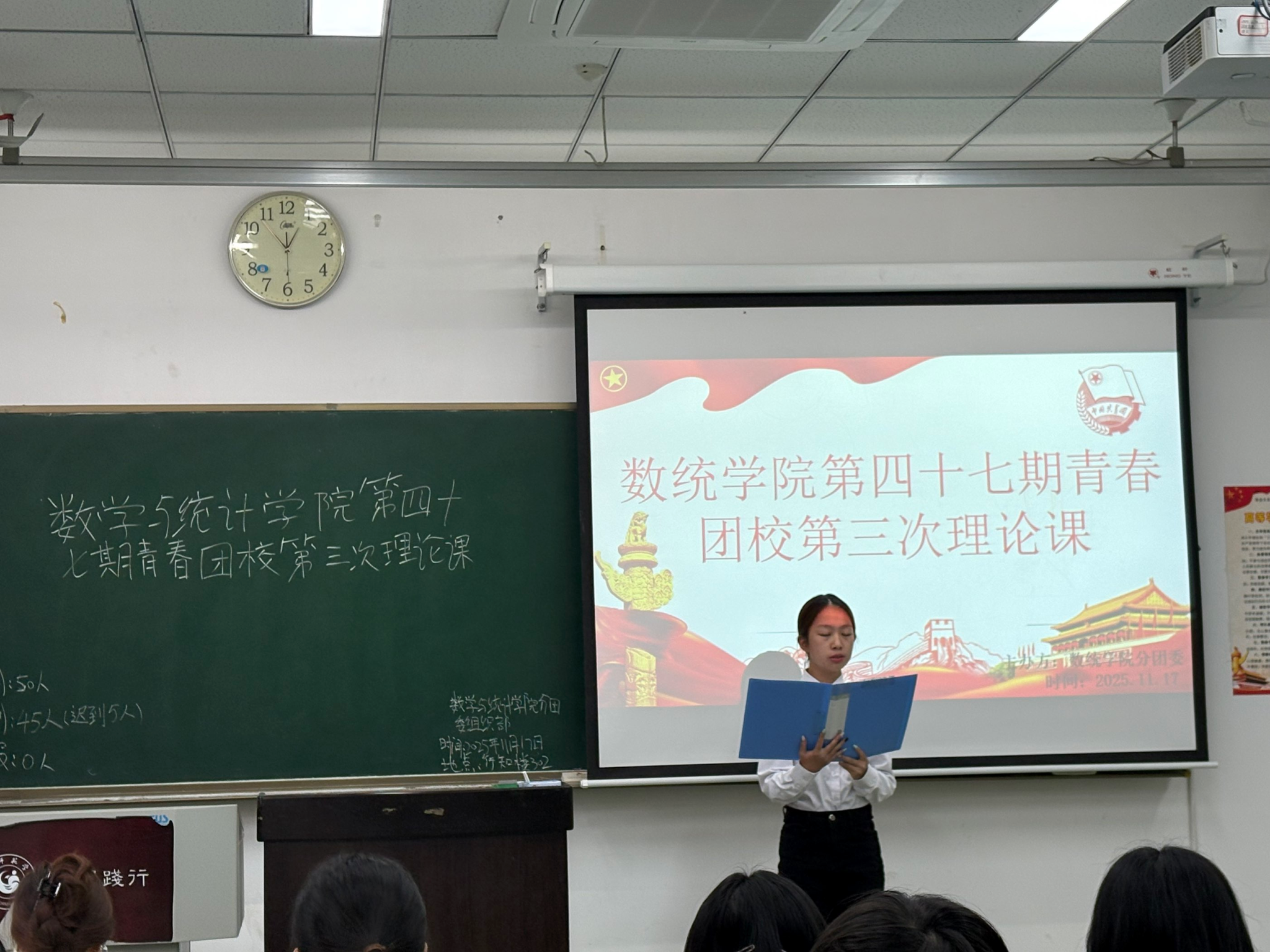 本网讯(图/杨欣悦,文/唐平)11月17日中午,学院第47期青春团校第三次理论课在行知楼327教室顺利开展。本次团课以“传承青运精神,践行青春使命”为主题,马克思主义学院教师李宁、全体团校学员共同参与。