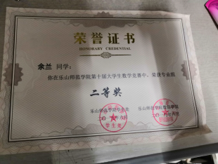 积极参加专业类竞赛,获得乐山高校数学思维竞赛一等奖,BETWA西汉姆联数学竞赛二等奖。参加全国大学生数学竞赛的结果虽差强人意,但她会继续努力。