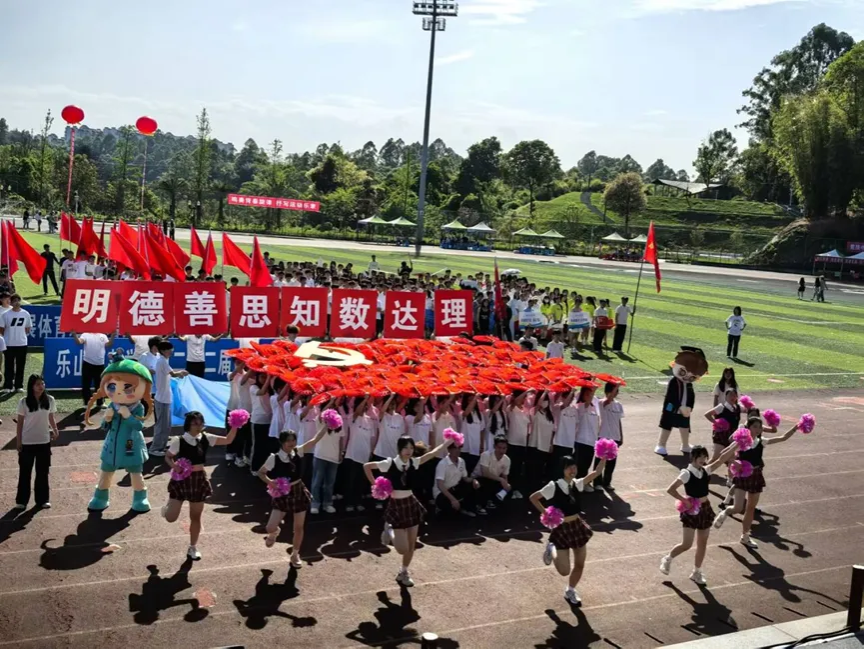 入场式环节亮点纷呈,15个学院方阵各显其能。其中数理学院方阵以学科特色为创意核心,成为全场焦点。100名学子身着白衫黑裤,手持红黄双色花球组成的数学符号矩阵。主席台前,方阵连续变换出党旗、坐标轴等图形,最后定格为"我爱乐师"字样,将理性之美与运动活力完美融合。