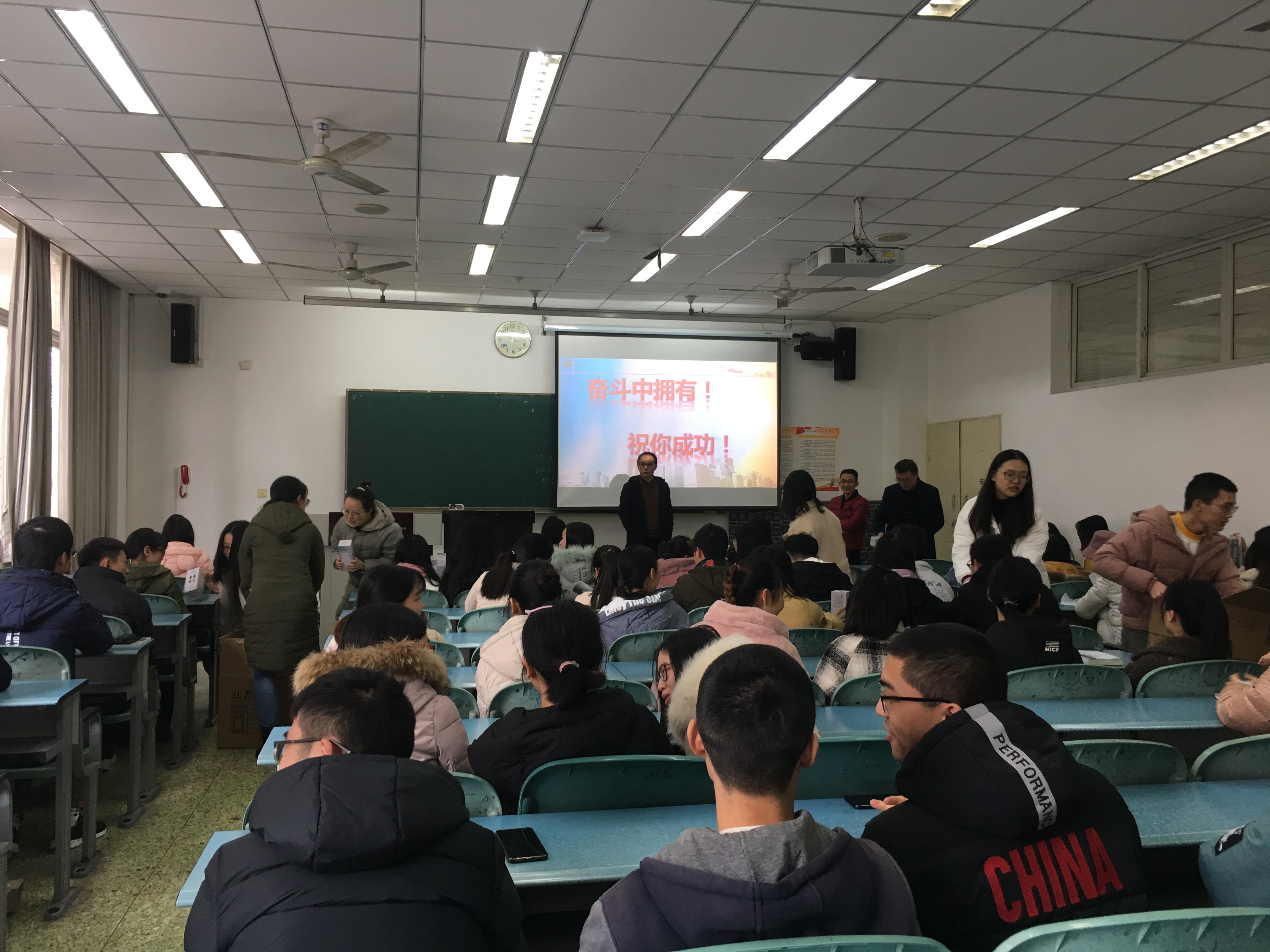 余书记代表学院对考研学子们致以最亲切的问候,并指导同学们关注时事政治,把握好政治科目的复习方向。龙院长从专业复习的角度指导同学们如何利用好最后冲刺期,并鼓励大家坚持到底。接着,王书记对莘莘学子提出殷切希望:希望同学们在奋斗中拥有,并预祝大家考研成功。最后,在温暖氛围中给同学们发放了慰问品。