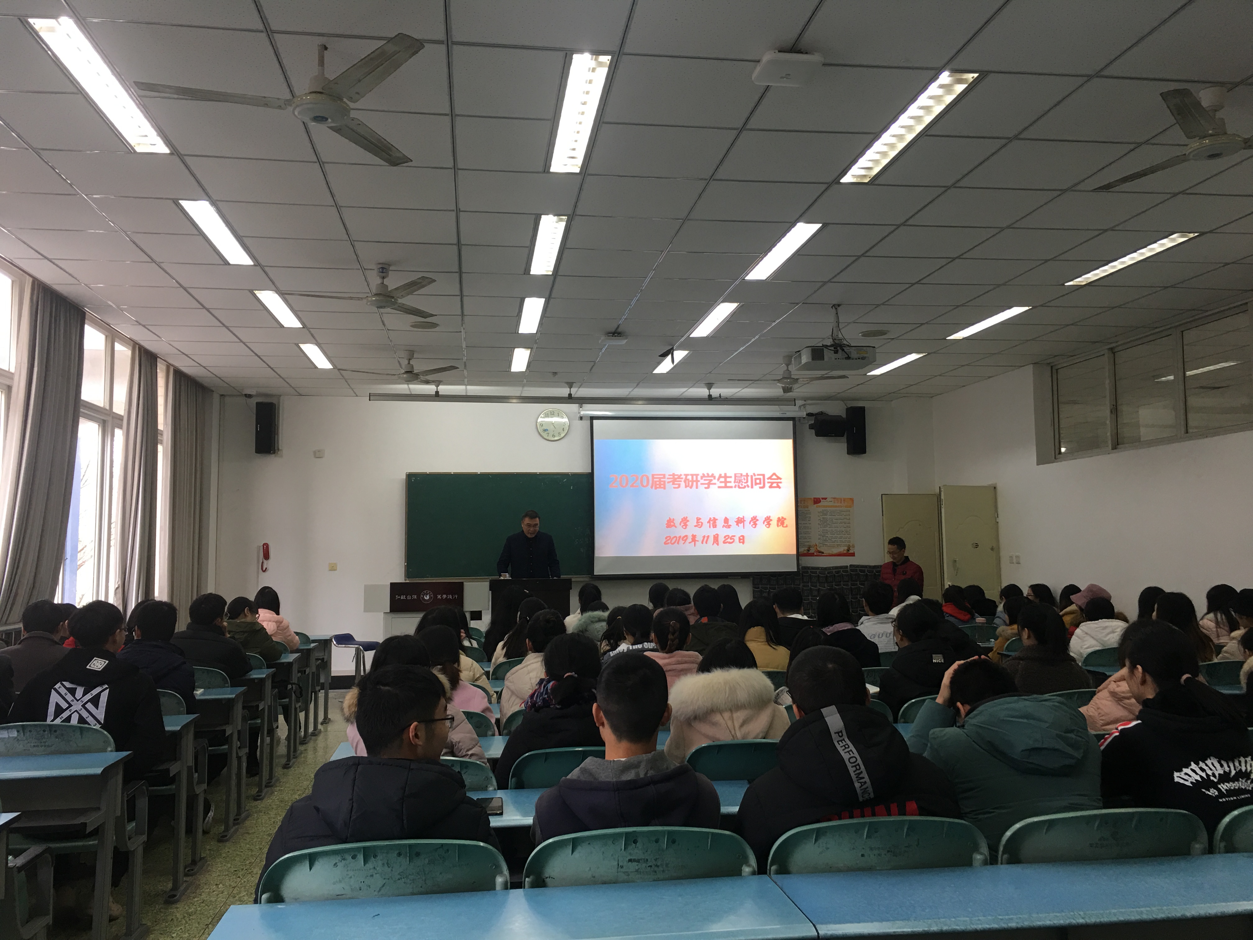 本网讯(图/文 江纳)2019年11月25日上午11:00,数信学院在行知楼113教室开展了对2016级考研学子的慰问活动。参加本次活动的有党总支书记余德刚、院长龙述君、党总支副书记王志明、16级辅导员江纳以及数信学院考研学子。