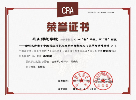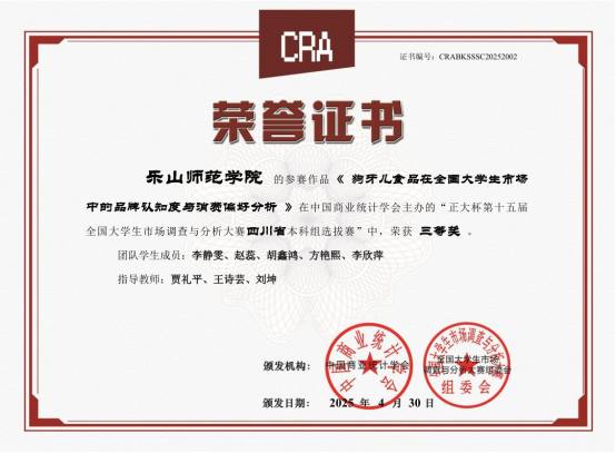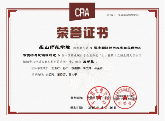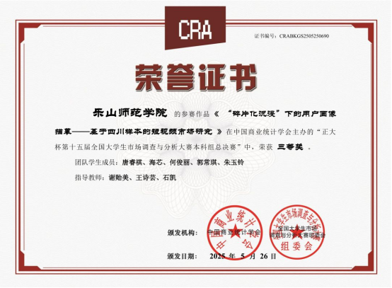 本网讯(文/石凯、图/王诗芸)2025年5月底,由中国商业统计学会主办的“正大杯”第十五届全国大学生市场调查与分析大赛本科组总决赛落下帷幕。本届大赛自2024年9月启动以来,经过知识赛、校赛和省赛的层层选拔,最终共有273支本科生参赛团队进入全国总决赛。BETWA西汉姆联代表队在数理学院的组织安排下表现优异,继去年第十四届首次获得1项国赛三等奖后再创佳绩,本次比赛获得了3个国赛三等奖、1个省赛二等奖和1个省赛三等奖,在省内同类院校中名列前茅。其中,获得国赛三等奖的团队为王诗芸、谢贻美、余孟玲担任第一指导教师,滕新华、唐睿祺、王玉红等同学组队,参赛题目分别为《文化新声,以“剧”传益—媒体用户短剧社会效益协同优化与其营销策略》、《“碎片化沉浸”下的用户画像描摹—基于四川样本的短视频市场研究》、《数字经济时代大学生在线学习消费行为及偏好研究》。