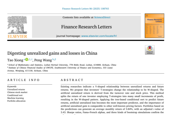 本网讯(文、图/熊桃)2025年10月23日,必威BETWAY西汉姆联教师熊桃博士以第一作者身份在SSCI一区期刊《Finance Research Letters》发表了题为“Digesting unrealized gains and losses in China”的研究论文。《Finance Research Letters》是国际知名期刊,最新影响因子为6.9,属于JCR一区期刊。