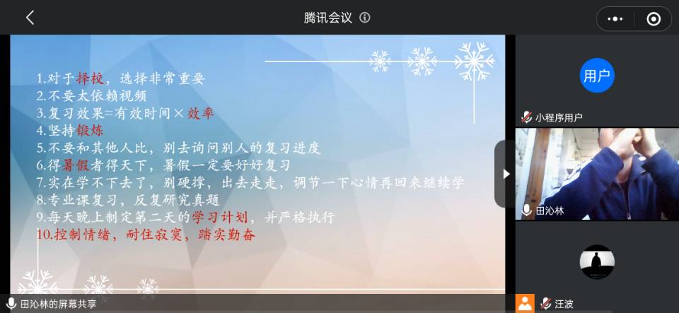 最后,马力强总结了同学们在备战考研过程中需要注意的问题,强调要积极借鉴师兄、师姐们的宝贵经验,少走弯路,主动搜集考研信息,根据自己实际情况做好考研的院校定位,规划好自身的学习计划,坚定自己的目标,脚踏实地,一步一步通向成功。