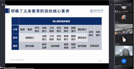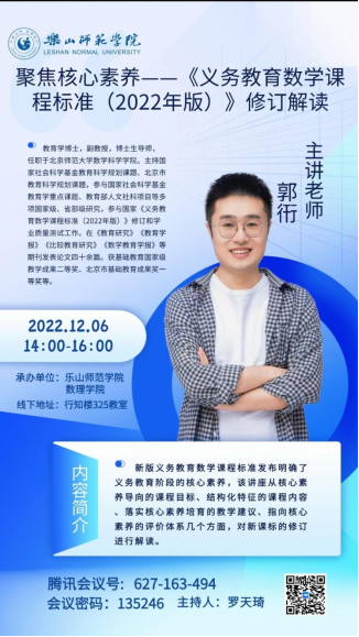 本网讯(文、图/罗天琦)为落实二十大报告精神,切实帮助学院师范生成长,12月6日下午,数理学院特邀北京师范大学博士生导师郭衎为数应专业师范生和数理学科教学法团队教师作了题为“聚焦核心素养——《义务教育数学课程标准(2022年版)》修订解读”的讲座。本次讲座由罗天琦老师主持,采用线上与线下相结合的方式进行,大三的同学在行知楼325教室参会,大四实习生和其他感兴趣的师生远程线上参加。