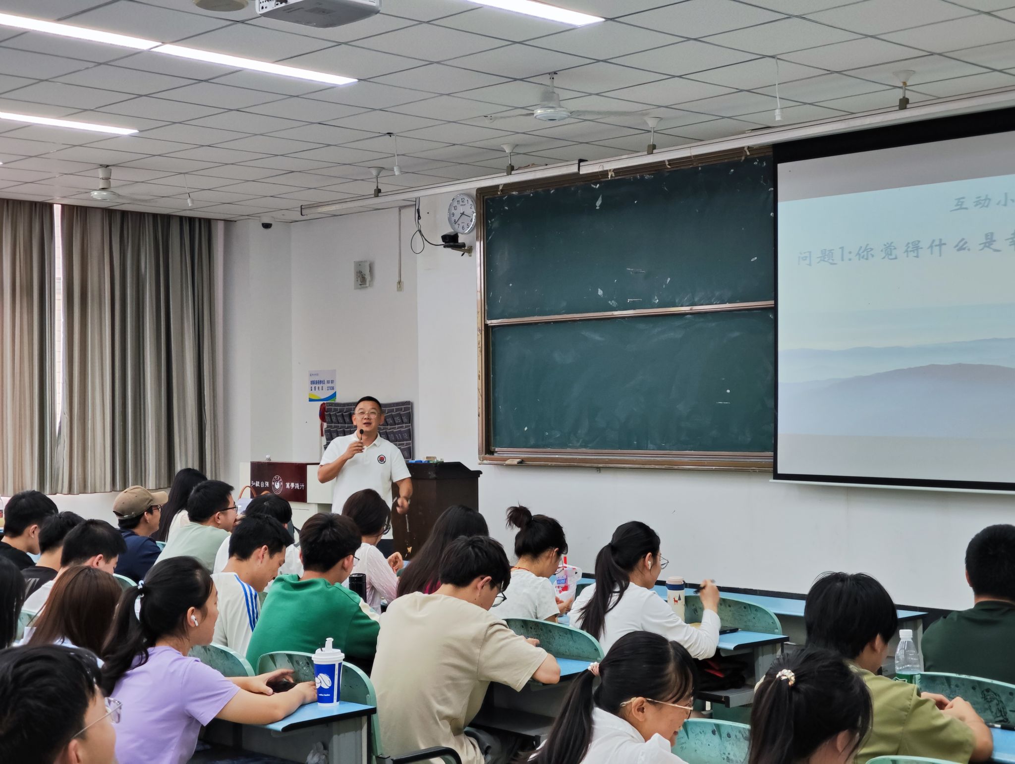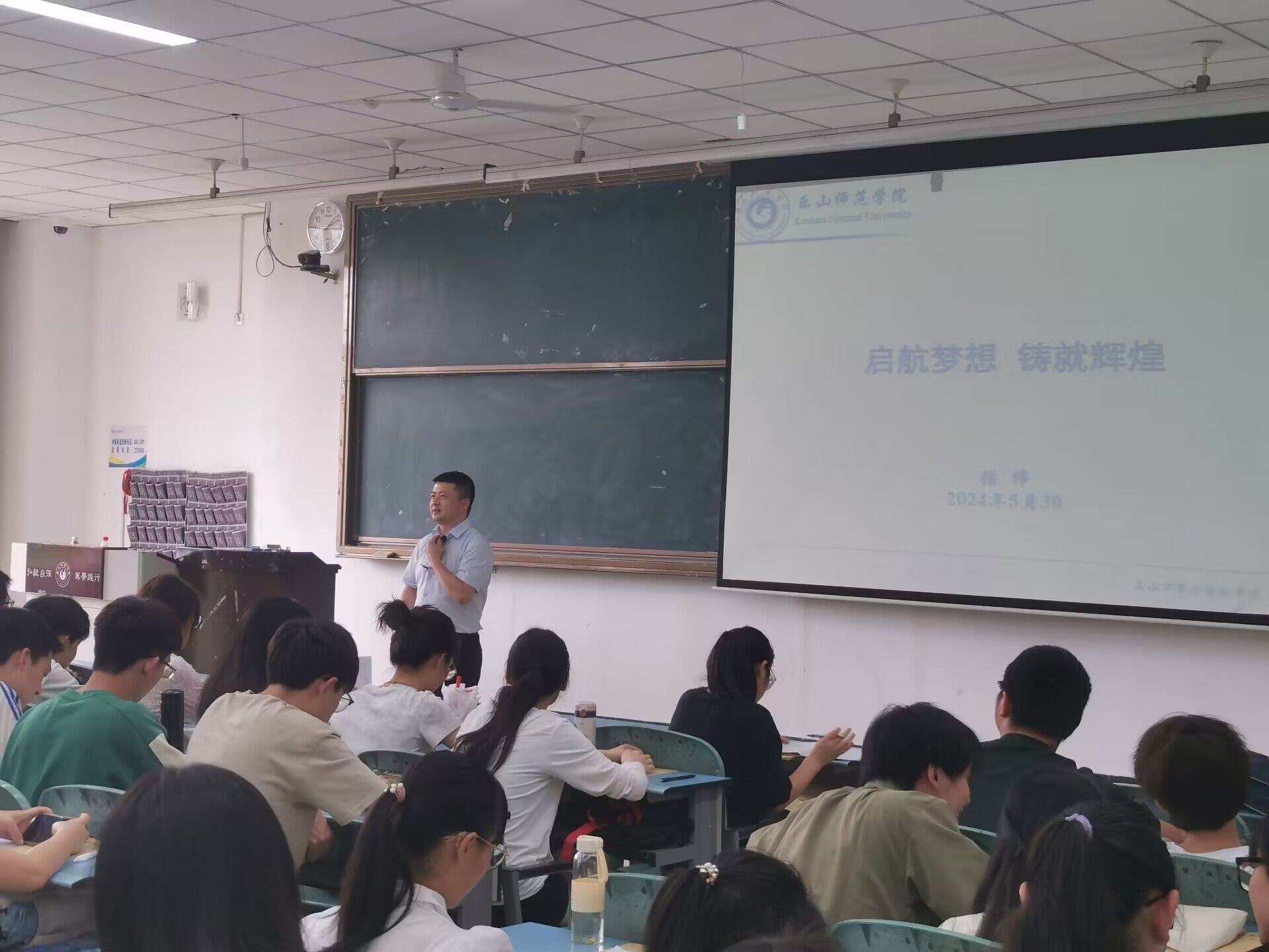数理学院优秀校友、乐山草堂高级中学校长张伟在行知楼225为23级数学与应用数学专业和物理学专业6个班级的学生做了题为《启航梦想,铸就辉煌》的讲座。张伟校长用自己的亲身经历生动得讲述了大学生应该如何度过自己的师范生大学生活,作为数理学院的优秀校友毫无保留地给学弟学妹传授人生经验。