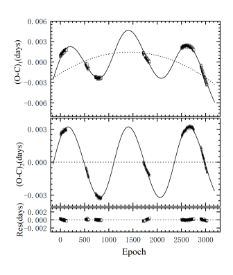 图2. V0405-Dra的O-C图。图中开口向下的抛物线(虚线),表明V0405 Dra的轨道周期正在线性减小,类似正弦曲线(实线)的周期性变化很可能是第三天体的光时轨道效应导致。