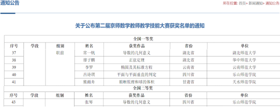 此次活动由北京师范大学数学科学学院、教育部中学教师教育研究虚拟教研室、教育部数学与复杂系统重点实验室主办,北京师范大学数学科学学院数学课程教材研究中心、北京师范大学出版社承办,主题是“落实2024年全国教育工作会议精神,推动数学新课程改革”。活动收到了来自北京市、天津市、重庆市、广东省、黑龙江省、吉林省、甘肃省等26个省市自治区的623位在职教师与职前教师的优秀作品。经过专家的评审,评选出常规组全国一等奖42个,全国二等奖47个,特色组全国一等奖10个,全国二等奖8个(无三等奖)。这一活动,汇集了全国各高校师范生和一线教师的优秀作品,获奖率很低,竞争空前激烈。我院选手初次参加这一比赛,并在四川省所有参赛高校中名列前茅。
