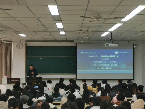 本网讯(文、图/于恩锋)11月28日下午,数理学院在行知楼101和125举办了“数理学院名师论坛”讲座,邀请成都树德中学三位优秀的高中数学教师和四川百分优课教育科技有限公司CEO为数学与应用数学专业学生做报告和交流。
