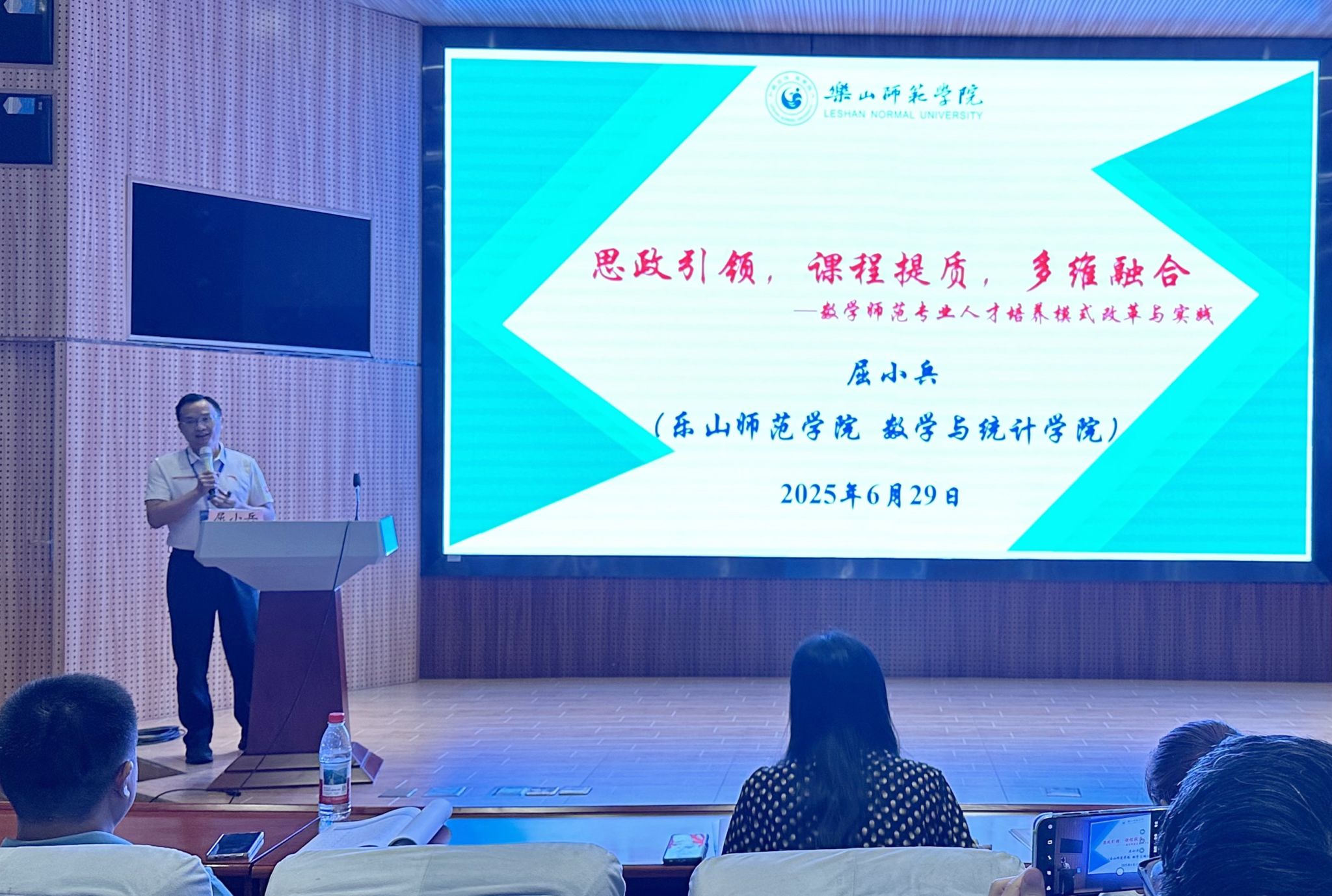 在“数学师范生专业建设”论坛中,数统学院屈小兵院长作了题为“思政引领、课程提质、多维融合——数学师范专业人才培养模式改革与实践”的报告,介绍了数统学院近年关于课程建设、教学科研、创新人才培养、学科竞赛、教学技能比赛等方面的成果,分享了数统学院在教育强国背景下“新师范”人才培养的创新举措,并与省内师范院校作了深入交流。