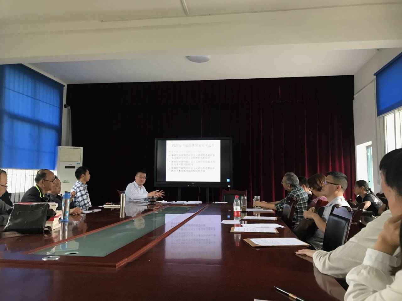 余德刚以《总体国家安全观之政治安全》为题,首先分析了新时代中国特色社会主义意识形态的特征,然后全面分析我国主流意识形态面临的挑战,他将这种挑战分为初级挑战、中级挑战和高级挑战三个不同的层次,逐一分析了这些挑战的表现形式,最后提出了统一思想,稳住阵脚;锁定领域,把握阵地;讲求方法,务求实效的应对策略。