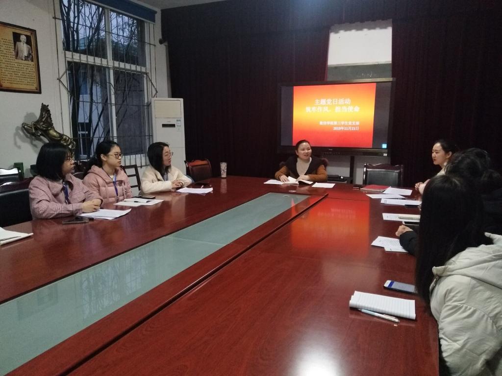 本网讯(图 白欣雨/文 阳惠)2019年11月21日晚上7:00,为了加强党员同志们的党性修养,坚定理想信念,提升道德境界,进一步加强党员教育,数信学院第三学生党支部在博雅楼会议室开展了主题党日活动。参加本次主题党日活动的有第三学生党支部的全体党员和预备党员。