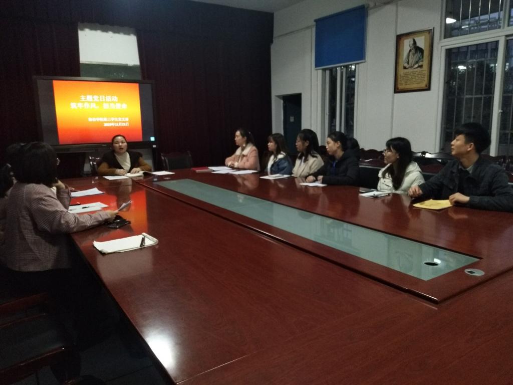 首先,江纳同志介绍了本次党日活动的主题为“筑牢作风,担当使命”,宣布此次主题党日活动正式开始。首先,宣传委员程旭带领党员同志们以铿锵有力的声音重温了入党誓词。其次,江纳同志带领党员同志们学习党章内容,结合实际给同志们讲她对党章的一些感悟。然后,党员同志们一起观看了焦点访谈—驻村第一书记:驻村更驻心,学习了靳康鹏同志的优秀事迹。程旭同志,李欣同志先后上台谈了自己观看视频的感悟。