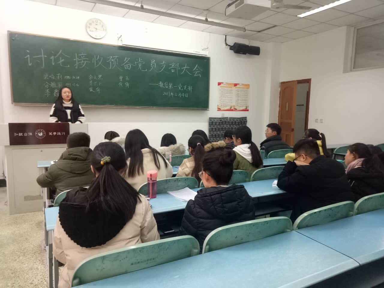 本网讯(文、图/梁咏莉、刘婧雅)数信学院第一学生党支部于2019年12月4日在行知楼124教室召开讨论接收预备党员支部大会。本次会议讨论接收余雅丽、侯仟等8名同志成为预备党员事宜,4名正式党员、10名预备党员以及8名发展对象共22人参加会议。
