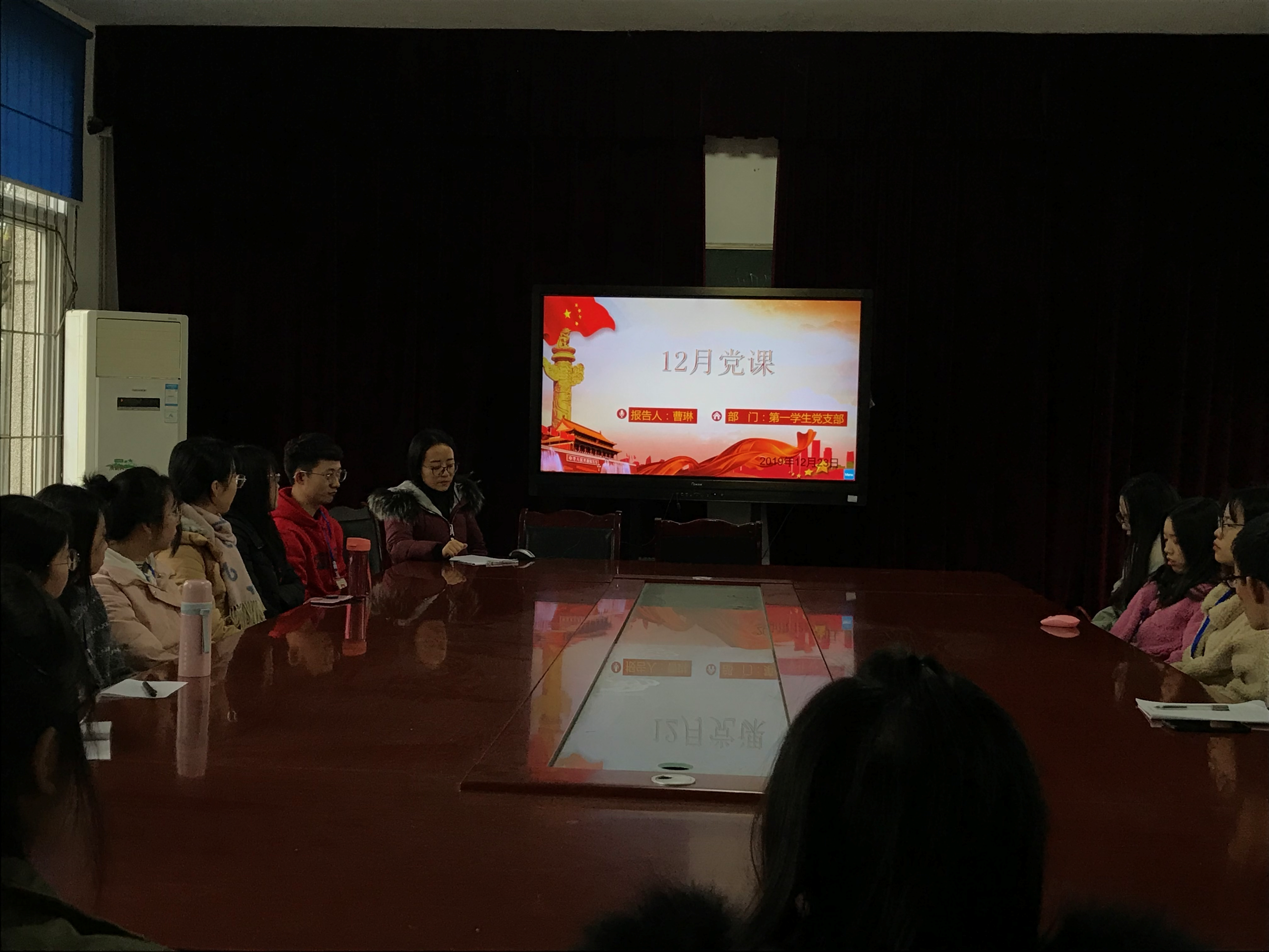 本网讯(文、图/母昌杨、陈甜甜)2019年12月22日下午5:30点,数信学院第一学生党支部于学院会议室开展12月党课与支部书记述职报告会议,党课主题为“党的路线、方针政策与形势任务、国情任务”。参加此次会议的有支部书记曹琳及22名党员同志。