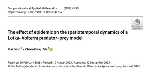 本网讯(文、图/樊华娜)近日,我院孙海教授与河南理工大学数学与信息科学学院马战平博士合作的两篇论文分别刊登在《International Journal of Biomathematics》(中科院二区),《Computational and Applied Mathematics》(中科院三区),我校为第一单位。两篇论文均聚焦非线性偏微分方程中的反应扩散模型展开研究